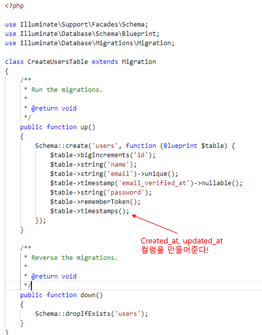 라라벨 프로젝트를 생성하게 되면 기본적으로 database\migration 디렉토리에 create_users_table.php와 create_password_resets_table.php 파일이 생성 되어 있다.