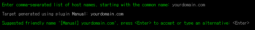 4. 인증서 등록에 필요한 본인의 도메인 명을 입력하고, 입력한 도메인이 올바르면 엔터를 입력한다.