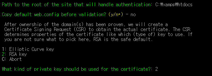 xampp 최상단 경로인 xampp\htdocs를 입력했고, web.config값은 저장하지 않을것이기 때문에 N을 입력했고,