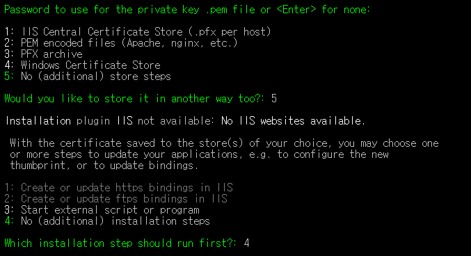 Password to use for the private key .pem file or <Enter> for none: 는 비밀번호를 입력할 거면 입력하고 아니면 엔터를 입력한다. 또 다른 곳에 저장할거면 번호를 입력하고 아니면 5번, 4번을 입력한다.