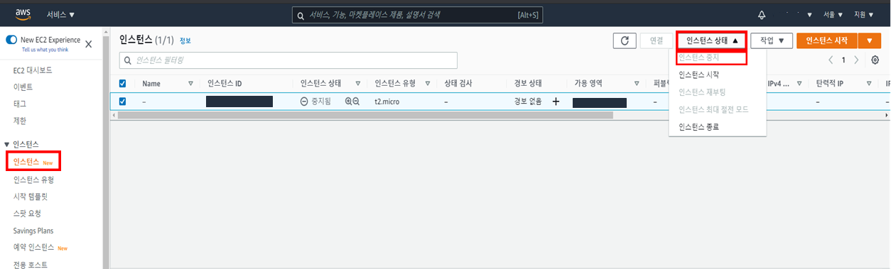1분정도 기다리면 인스턴스 상태 항목이 중지중 → 중지됨 으로 변경 된다.
