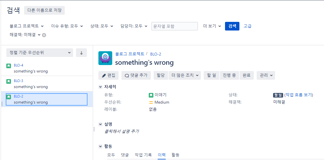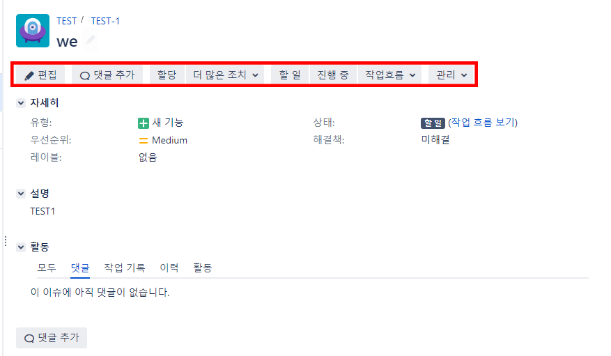 - 더 많은 조치 : 해당 이슈의 하위 이슈를 만드는 등 다양한 처리를 할 수 있다.