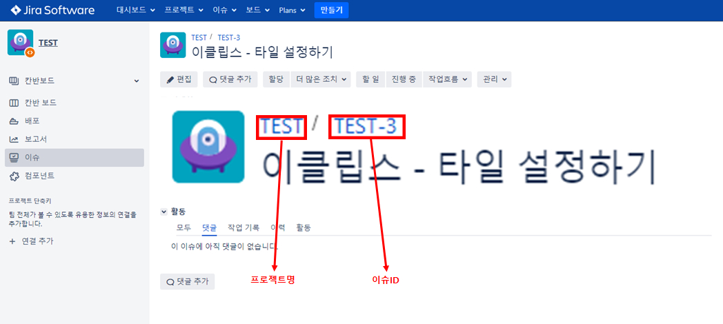 지라 이슈는 프로젝트명 + 이슈ID(프로젝트명 + Key)로 이루어져있다.