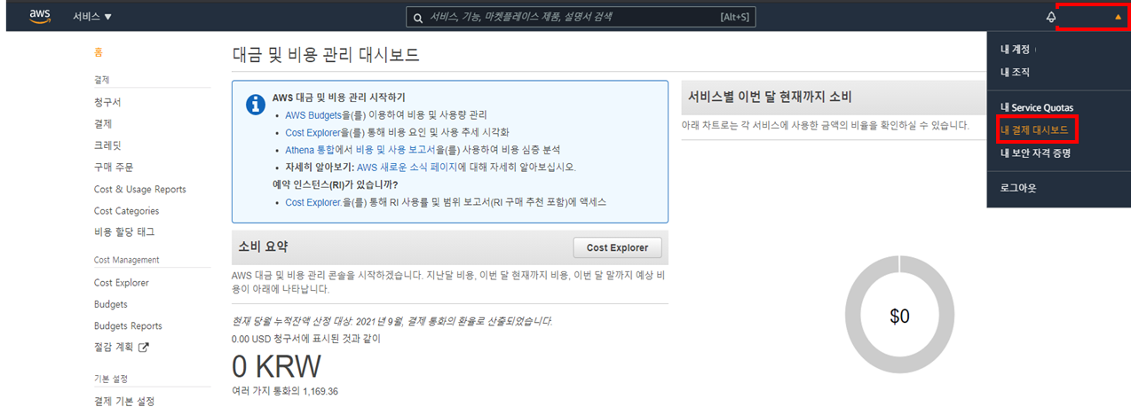 상단의 계정 화살표 모양을 클릭 후 내 결제 대시보드를 클릭하면 아래와 같은 화면을 볼 수 있다.