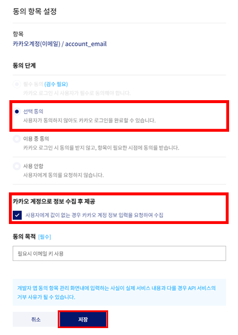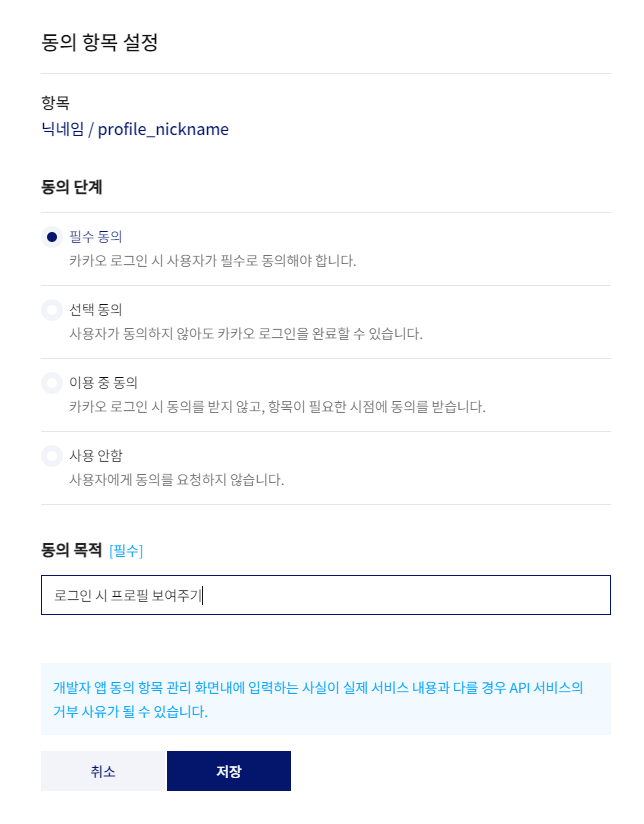 닉네임과 카카오계정(이메일) 두 항목 설정해보도록 하자.