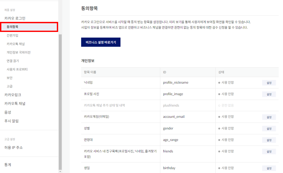 좌측의 동의항목 버튼을 클릭한다. 항목들은 모두 비활성화 되어있고 하나하나 설정이 필요하다.