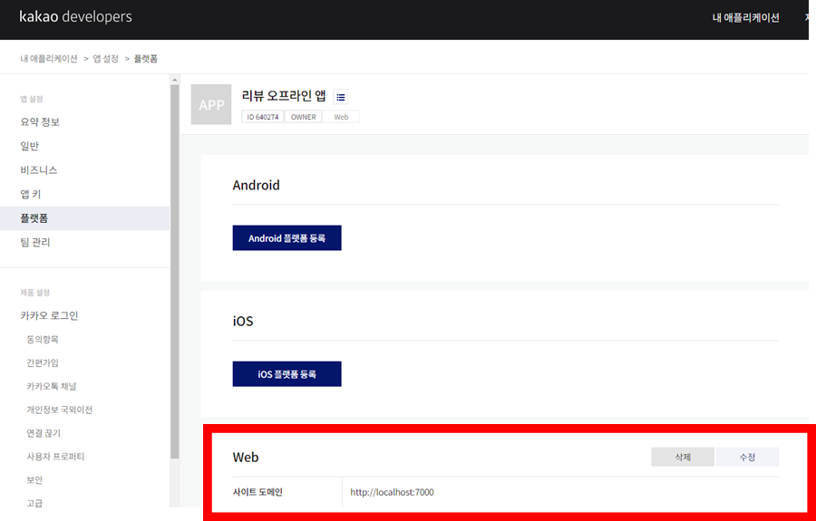 접속할 도메인정보를 등록한다. 등록하지 않으면 login.jsp에 선언된 kakao script를 호출하지 못하고 에러가 발생한다.