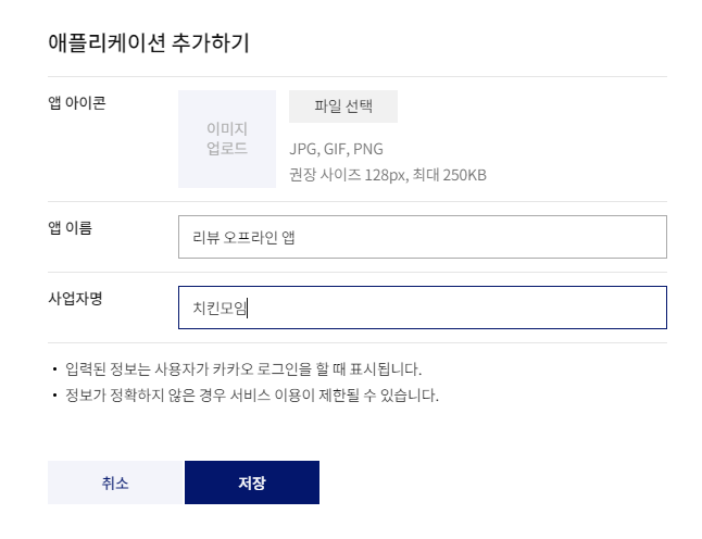 앱 이름과 사업자명은 테스트용이므로 임의값을 적어준다.