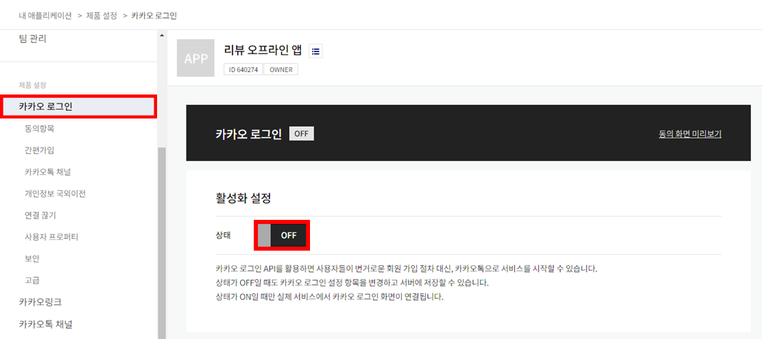 좌측의 카카오 로그인 항목을 클릭하고 로그인 API를 활용하기 위해서는 활성화 ON이 되어야 한다.