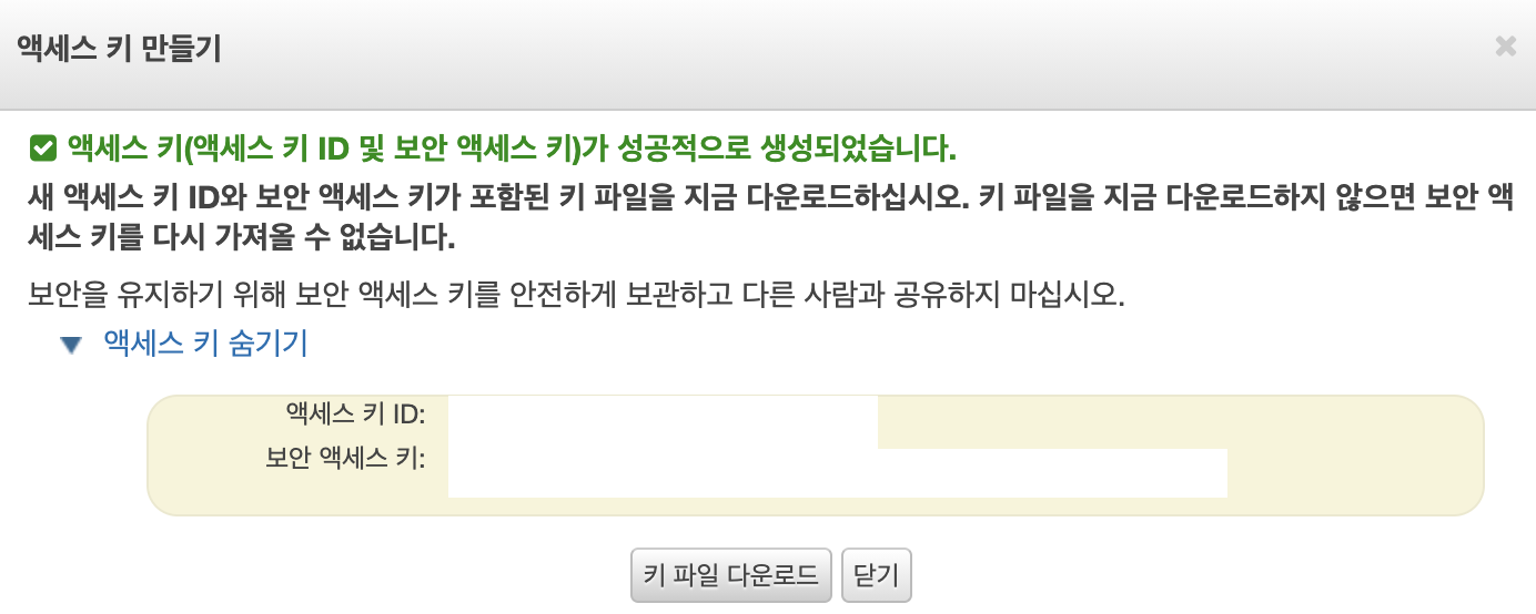 엑세스 키가 생성되고 키 파일 다운로드 버튼을 클릭해서 안전한 곳에 보관한다.