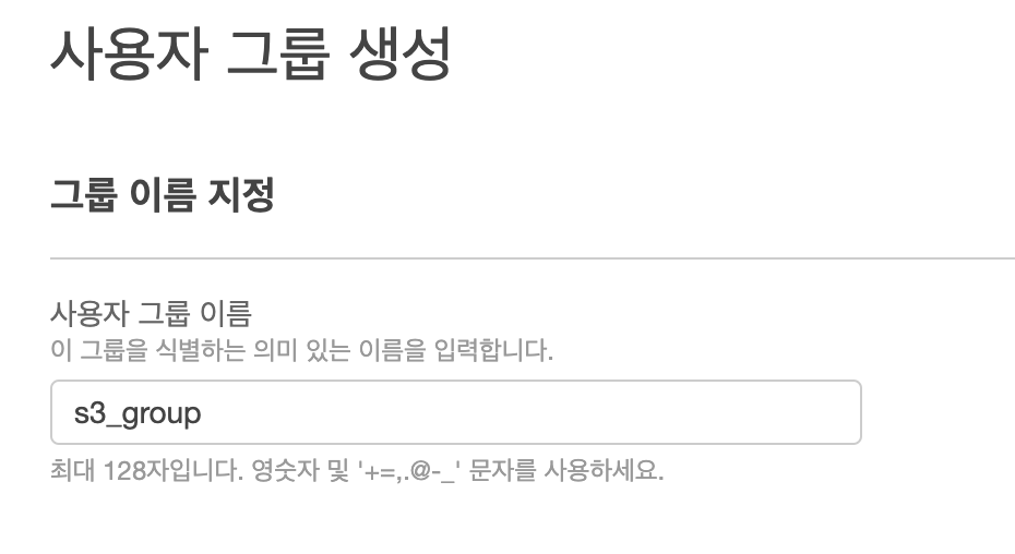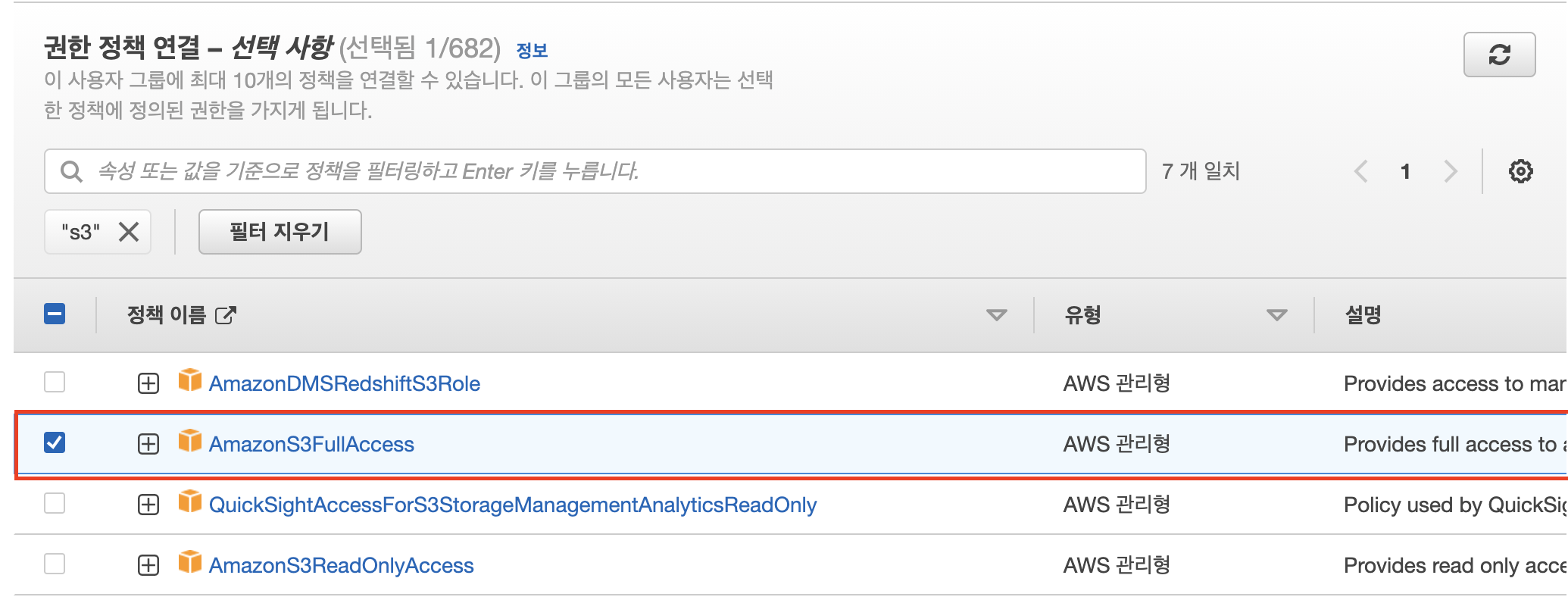 권한 정책 연결에서 AmazonS3FullAccess를 찾아 클릭하고 그룹 생성 버튼을 클릭한다.