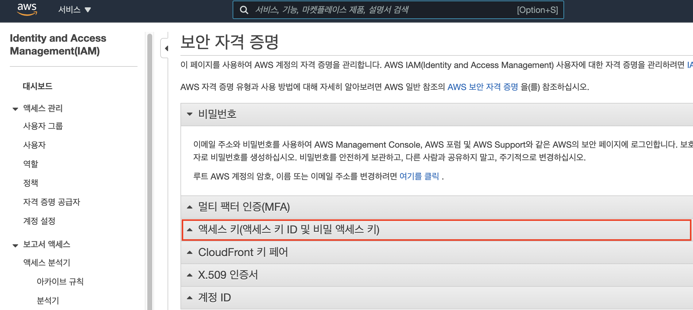 보안 자격 증명 항목의 액세스 키(액세스 키 ID 및 비밀 엑세스 키) 를 클릭한다.