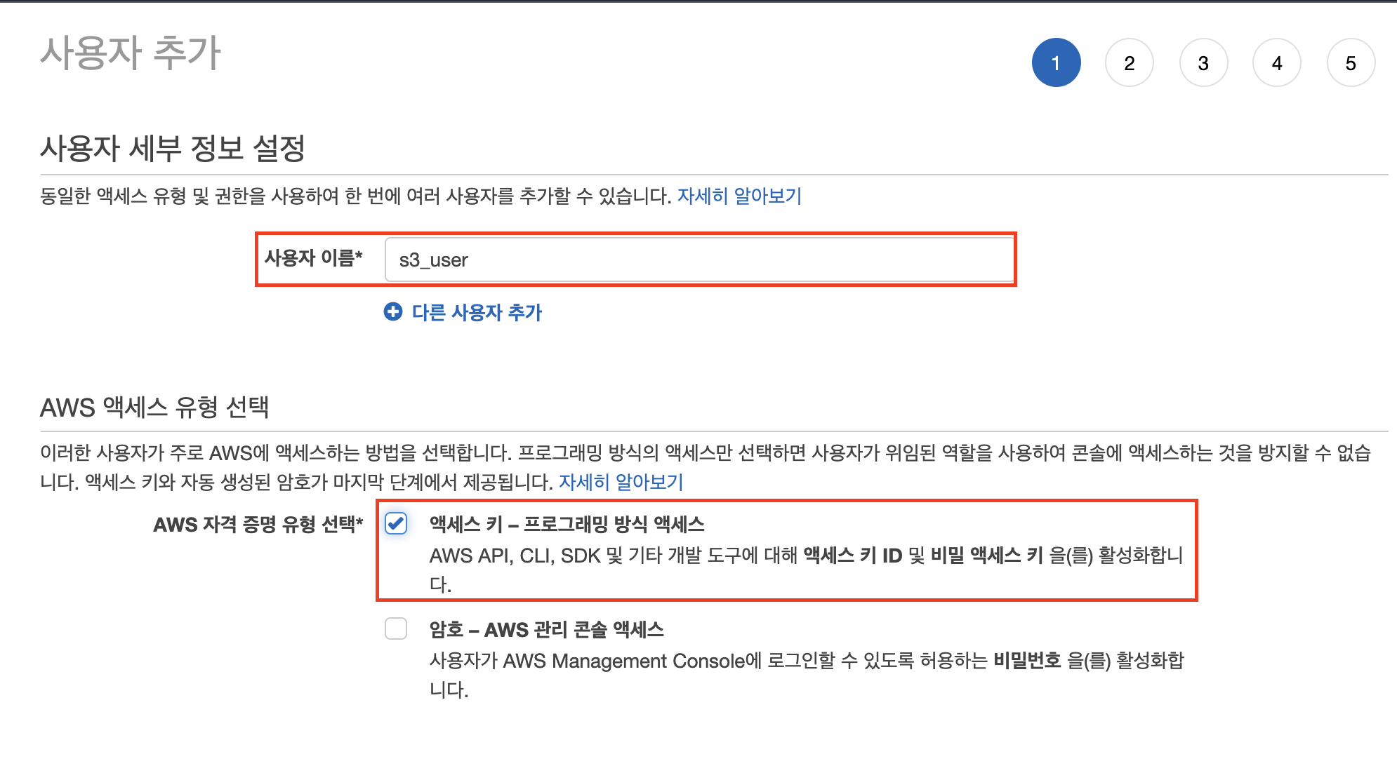 사용자 이름을 입력하고 자격 증명 유형은 액세스 키를 선택한다.