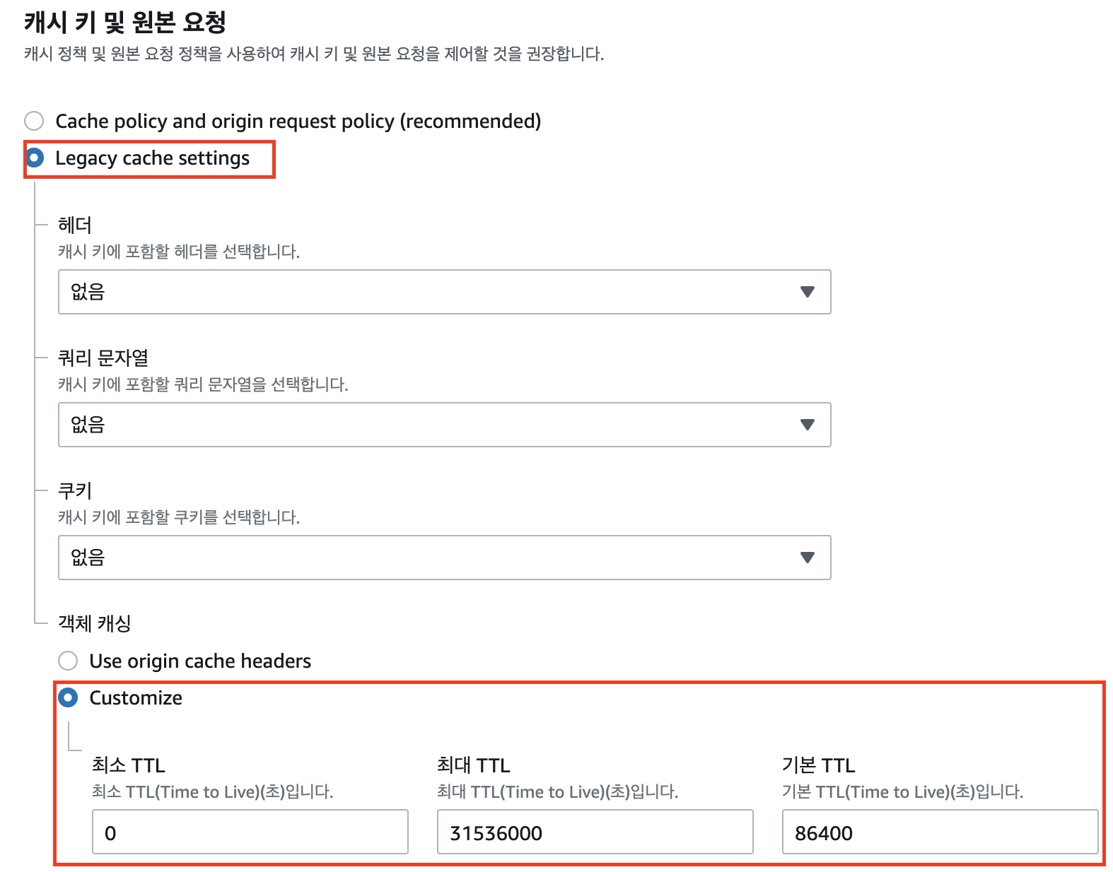 객체 캐싱 Customize를 선택한다.