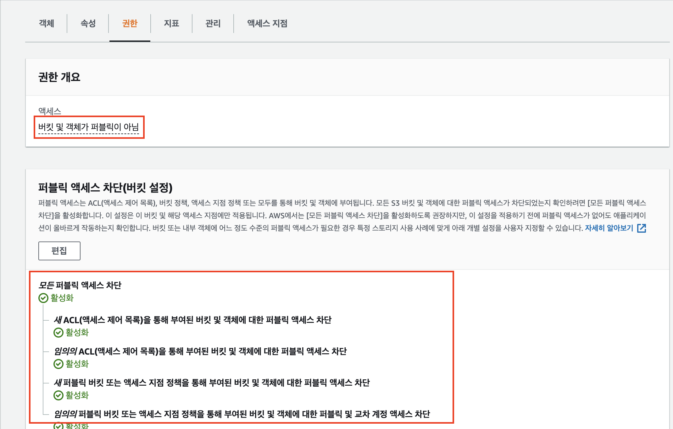 생성 당시 기본적으로 모든 퍼블릭 액세스가 차단되어있을것이다. 그러므로 s3버킷에 업로드된 객체 URL로 접근해도
