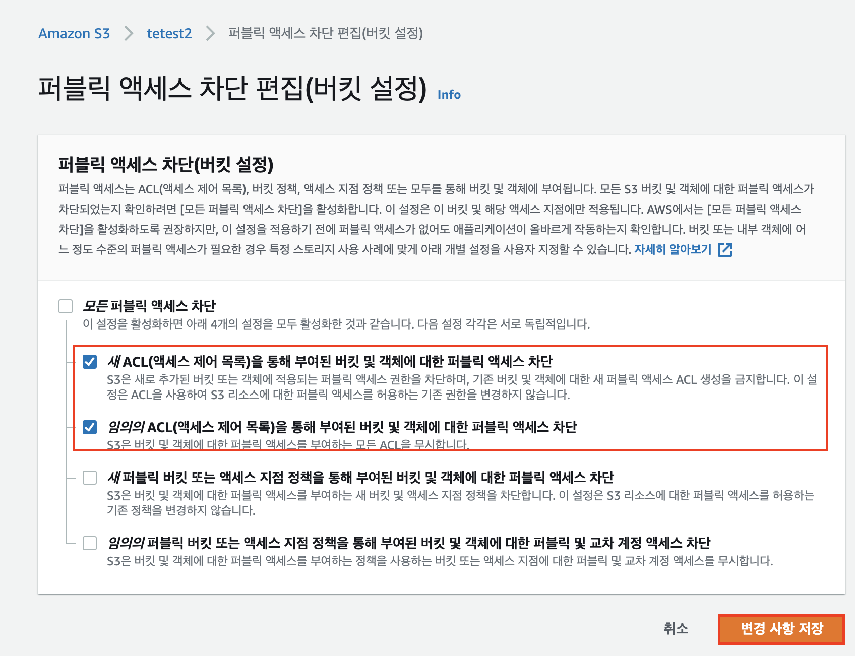 버킷 정책만을 사용하기 위해서는 위 2가지는 ACL에 관한것이므로 체크항목에 선택하고 저장버튼을 클릭한다.