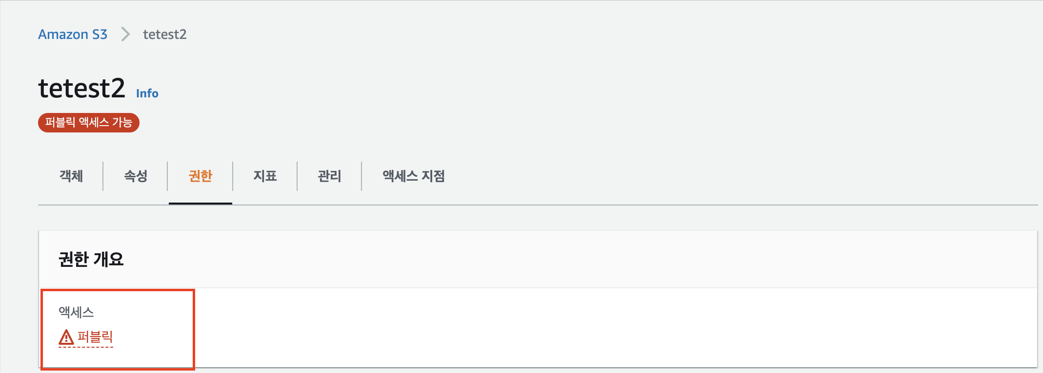 이전 포스팅에서 생성한 s3 버킷의 권한을 확인해보자.
