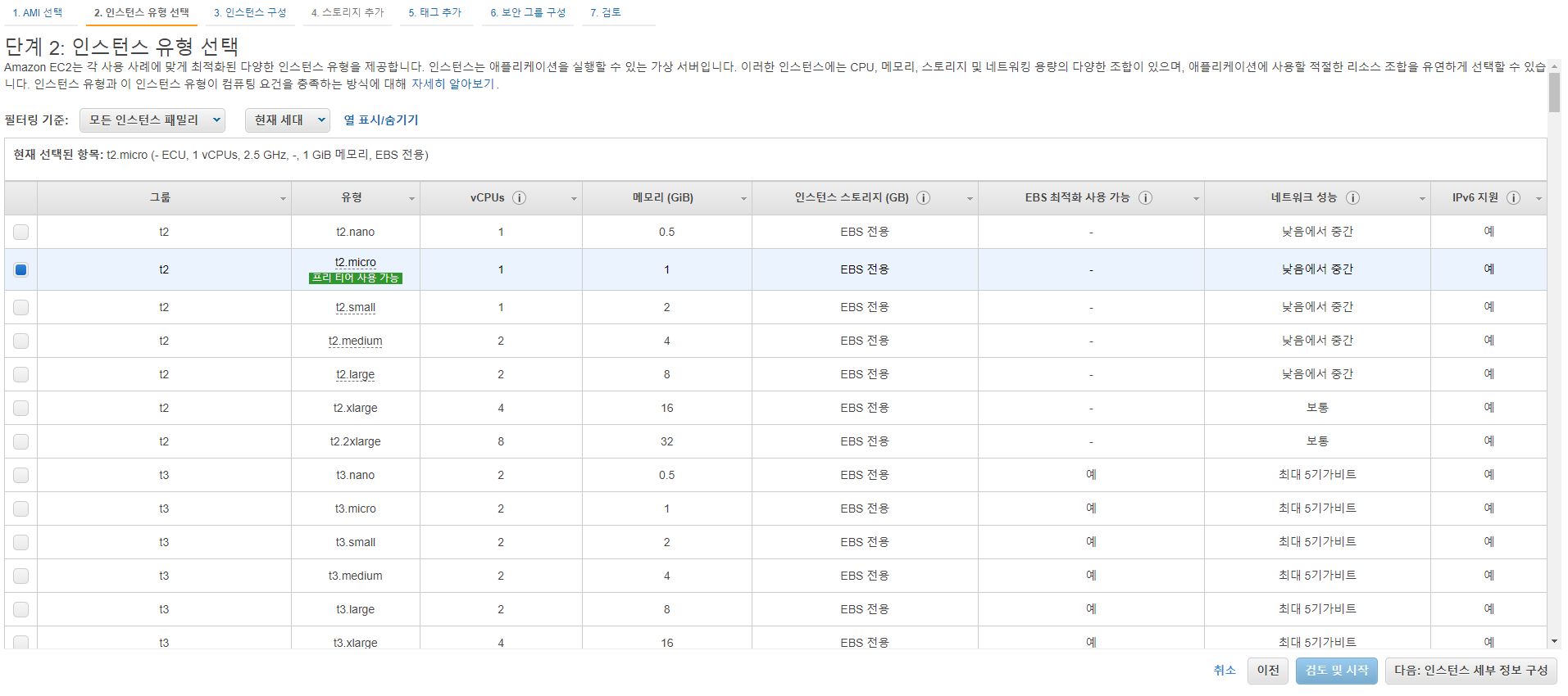 Amazon Linux 기준으로 t2.micro만 프리티어로 이용이 가능하다.
